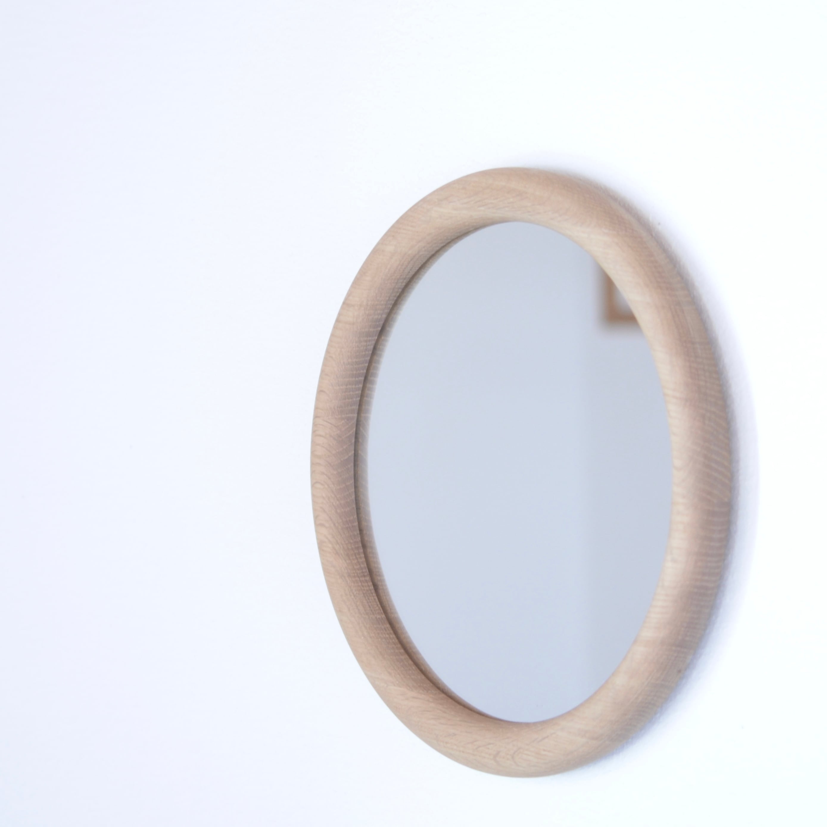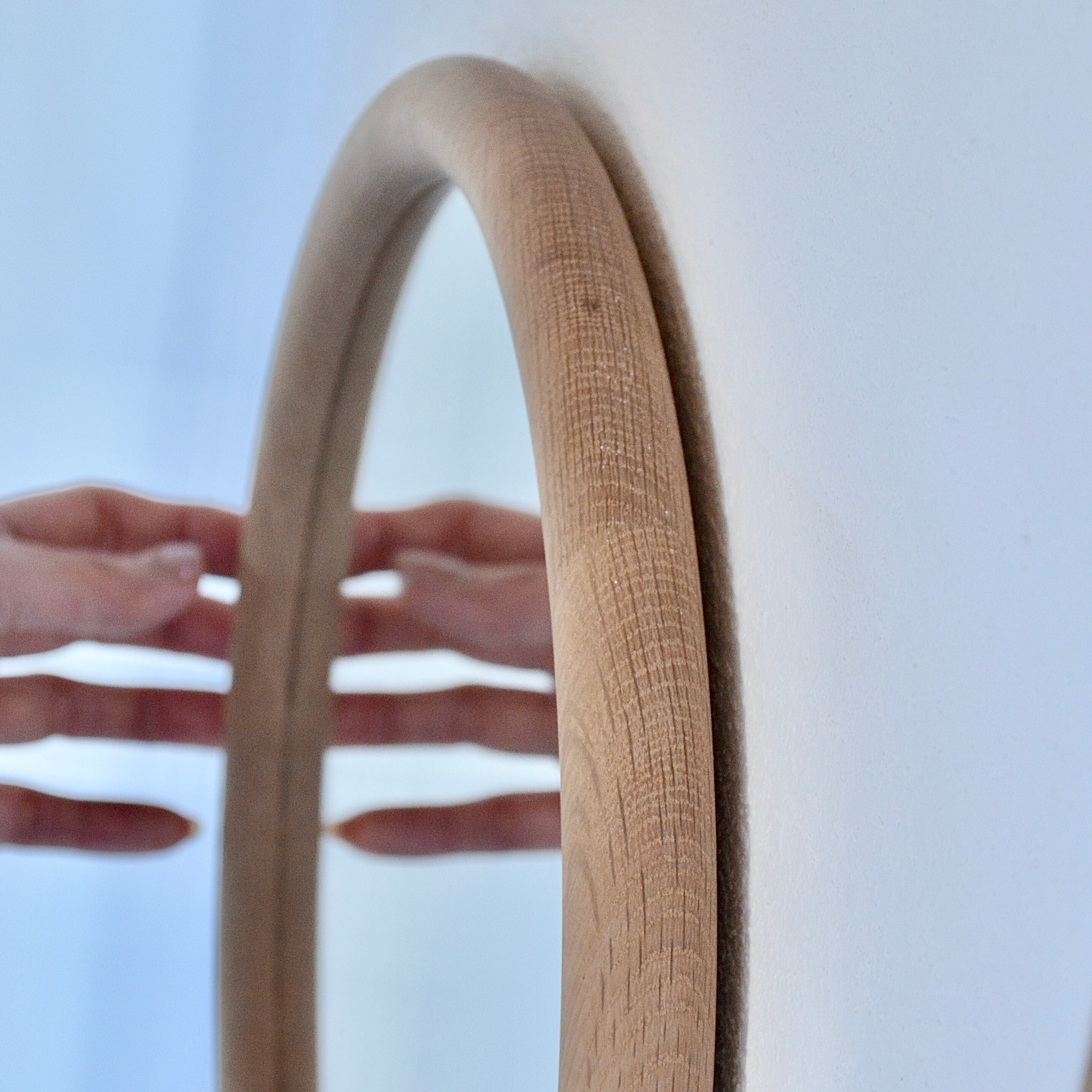 無垢材をリング状に、さらにその断面を円筒状に削り出したラウンドミラー。