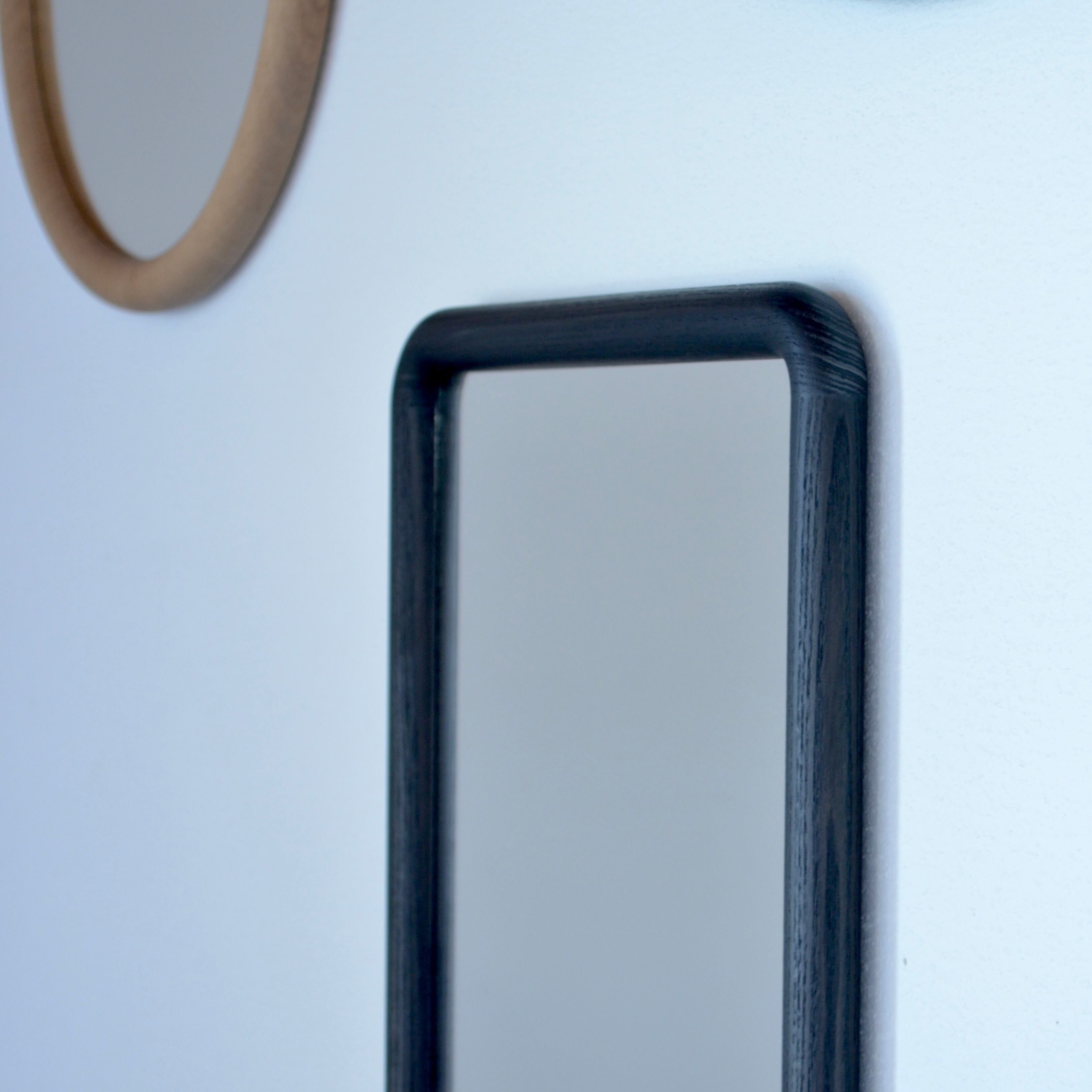 フレームの縦材と横材を仕口加工で組み、断面を円筒状に削り出した角丸型ミラー。