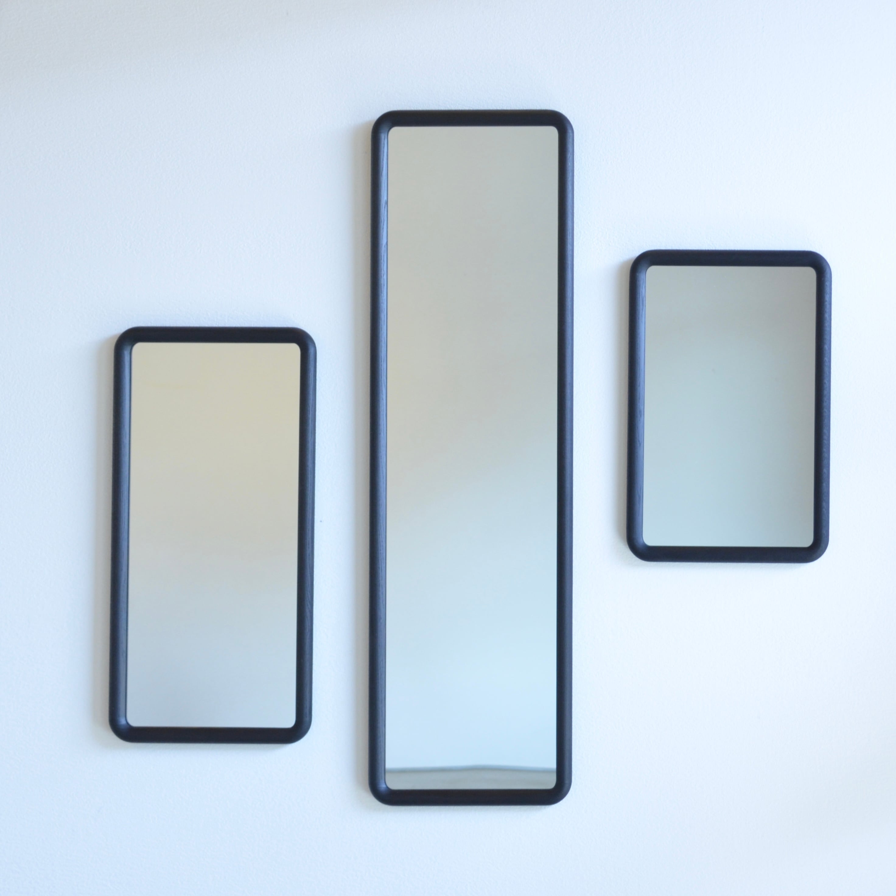 フレームの縦材と横材を仕口加工で組み、断面を円筒状に削り出した角丸型ミラー。