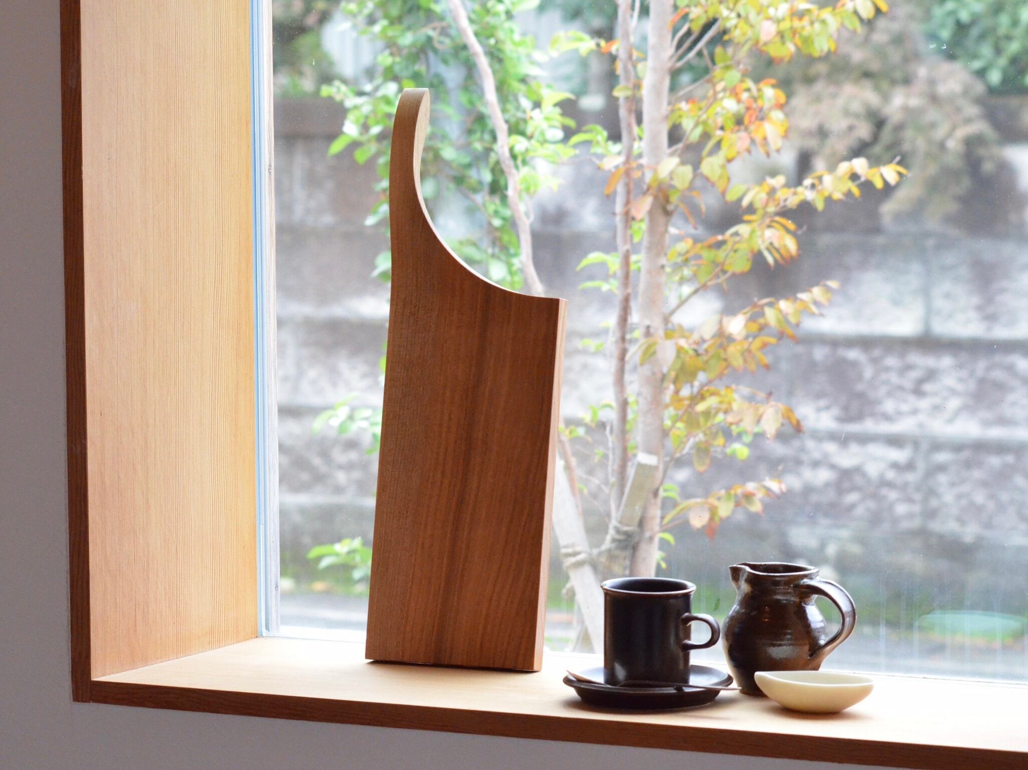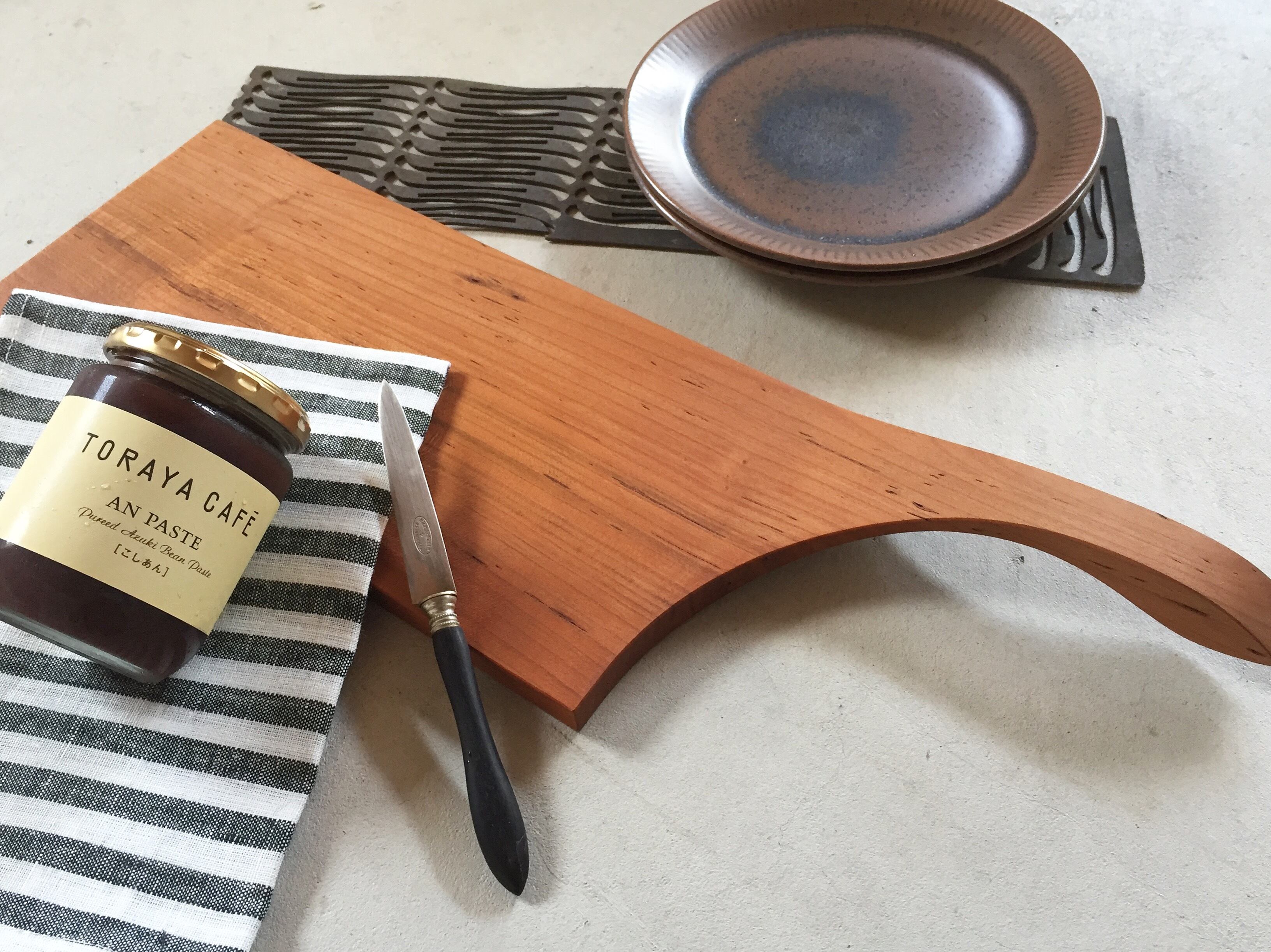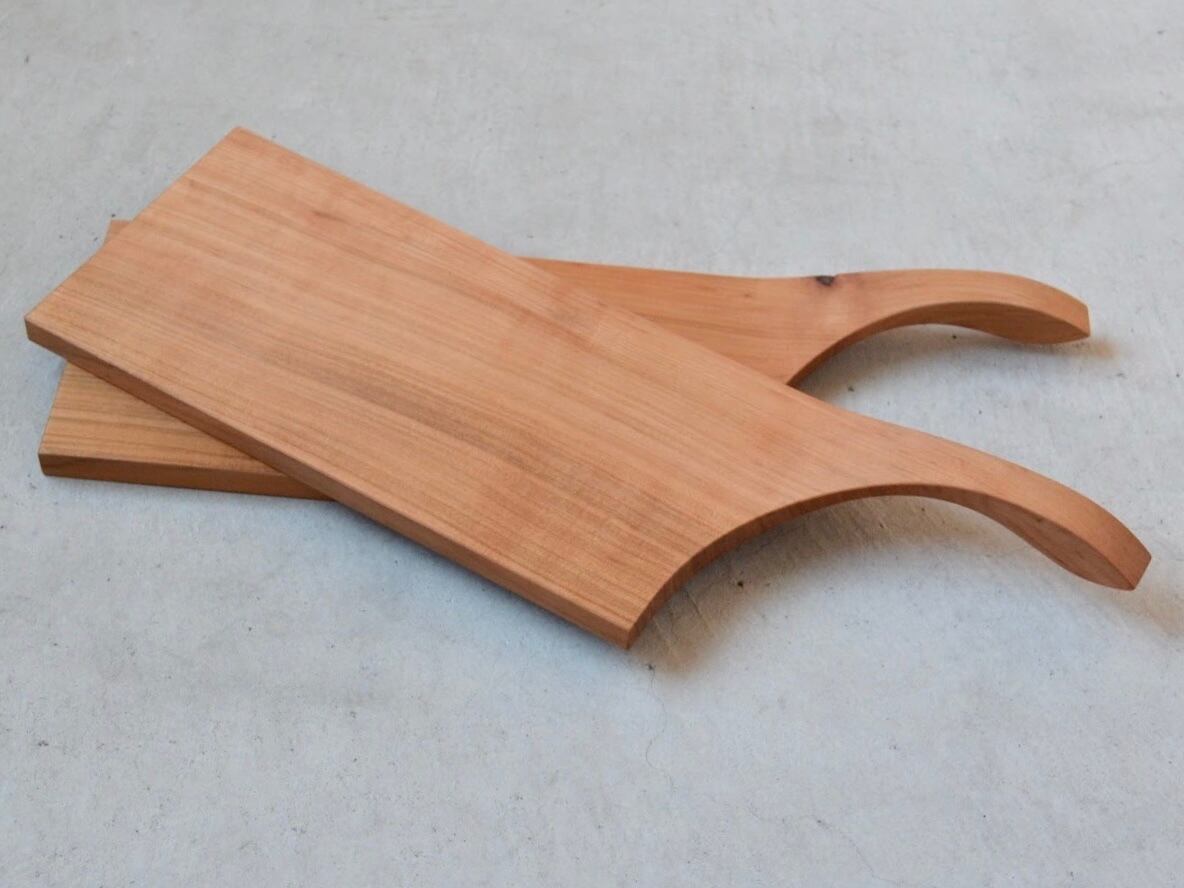 持ち手が浮いたようにカーブしているカッティングボードです。テーブルに置いた状態でもスムーズに持ち上げることができます。