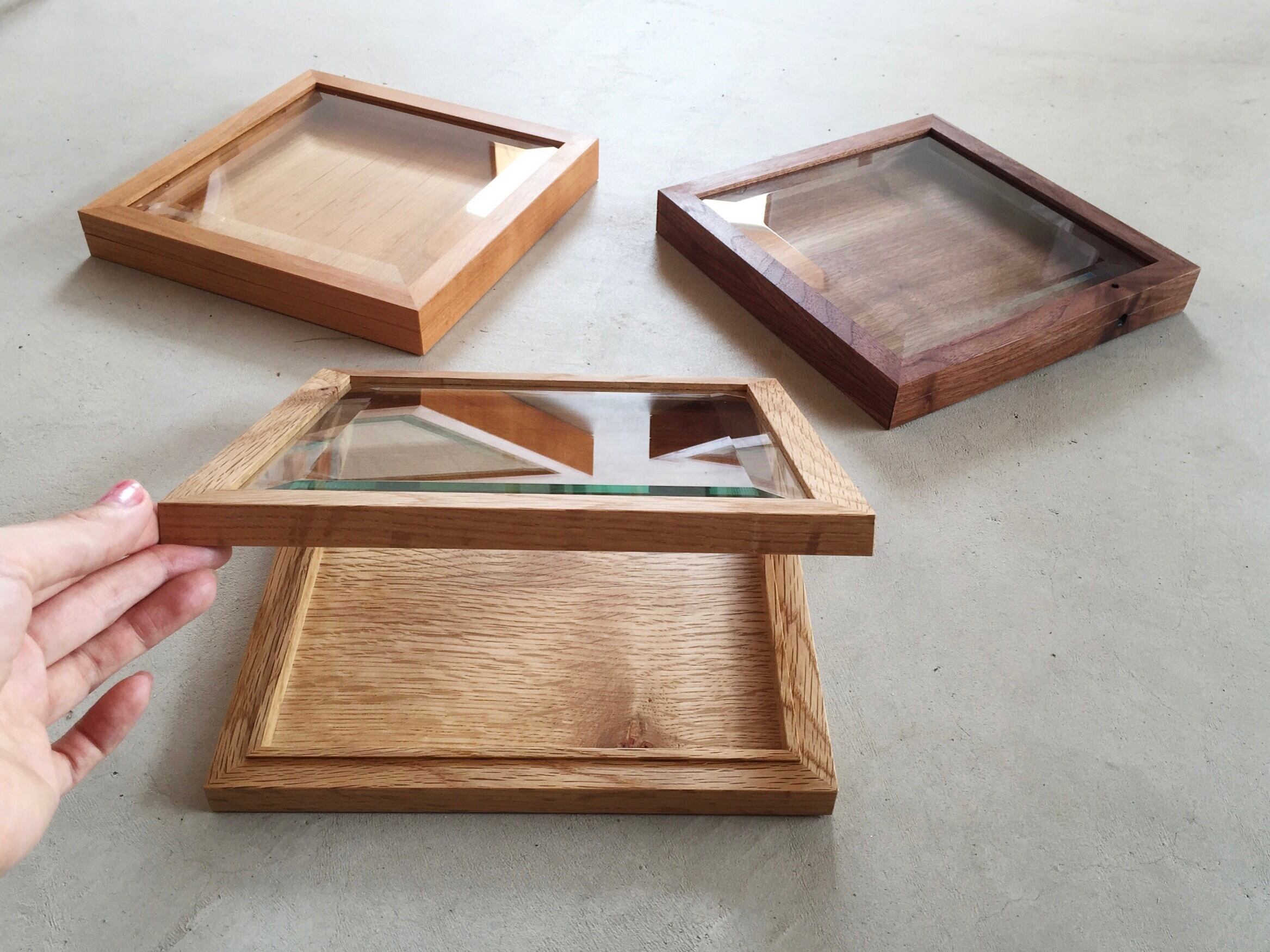 木とガラスを組み合わせたシンプルなアクセサリーケース。真鍮の棒を一本お付けしておりますので、開けたまま飾りたい時にお使いください。