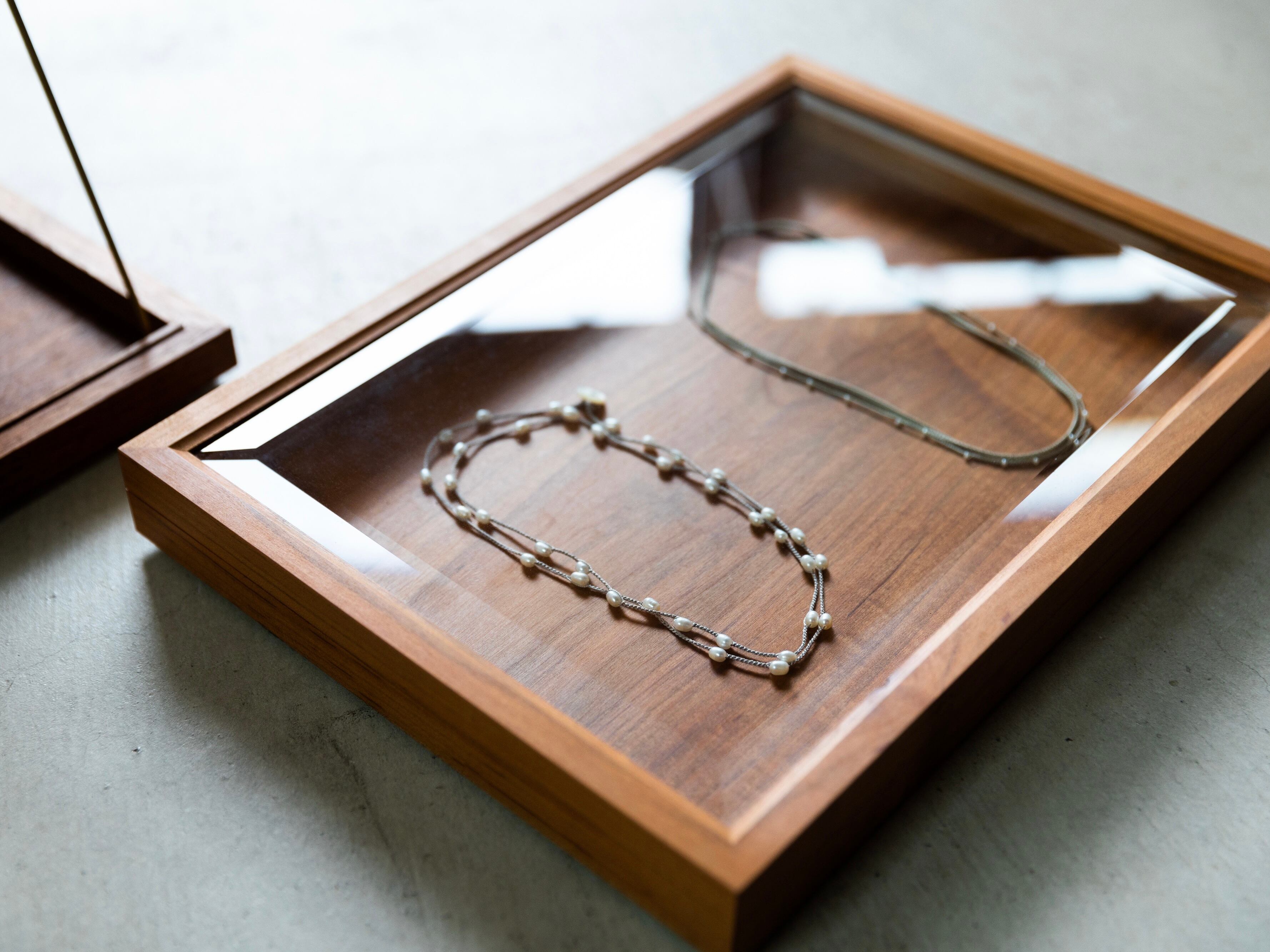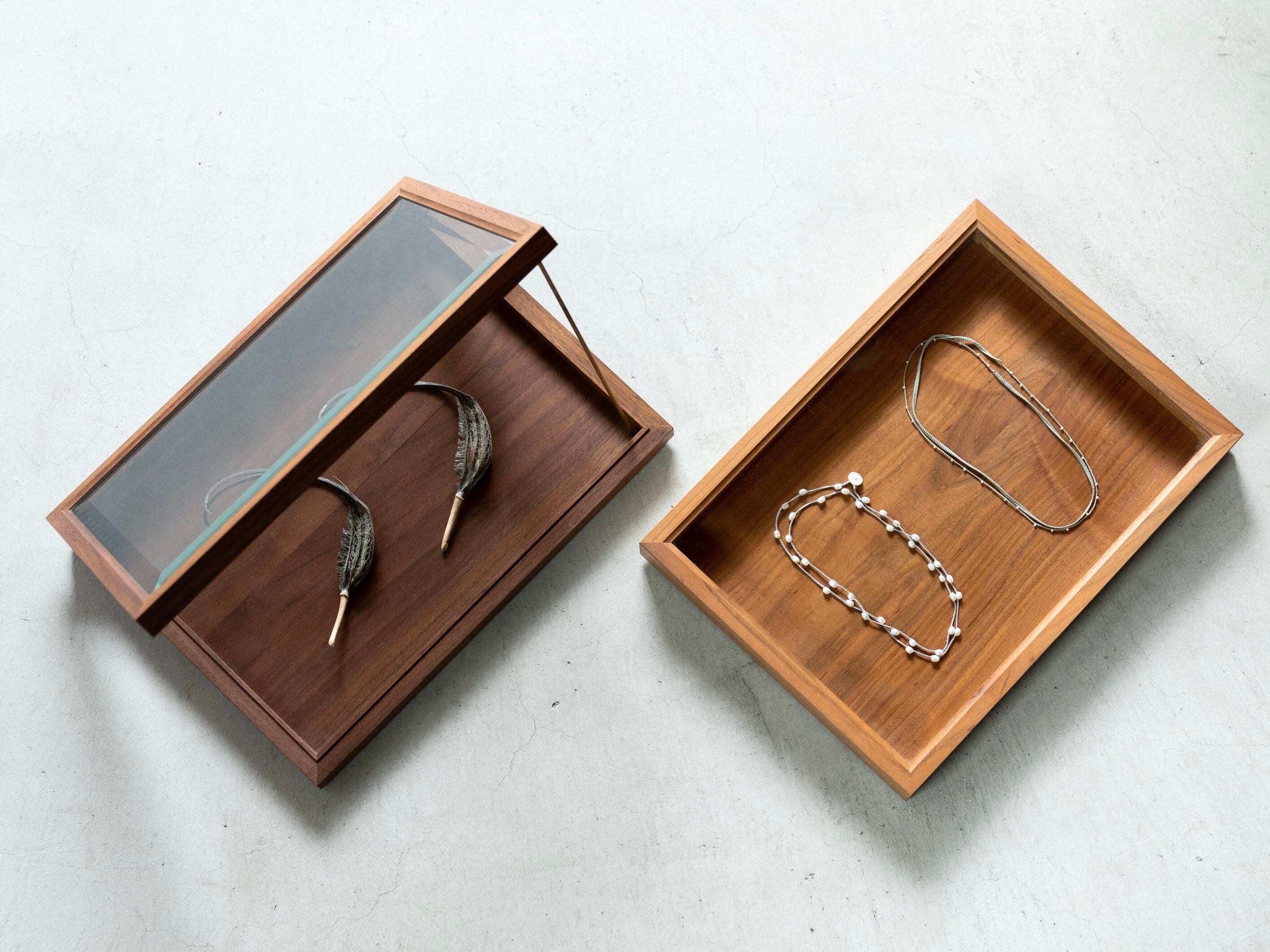 木とガラスを組み合わせたシンプルなアクセサリーケース。真鍮の棒を一本お付けしておりますので、開けたまま飾りたい時にお使いください。